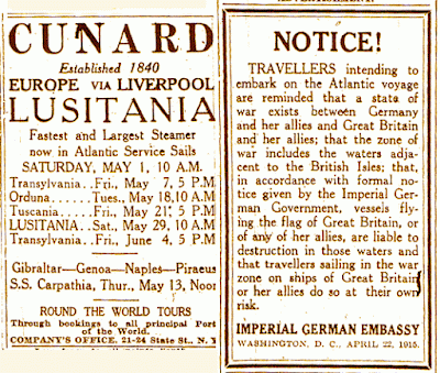 On Saturday, May 1, the British luxury liner RMS Lusitania left the Cunard Line's Pier 54 on the west side of Manhattan bound for Liverpool on its regular transatlantic run. That morning an advertisement placed by the German embassy appeared in the New York newspapers. It reminded travelers that a state of war existed between Great Britain and Germany and that Germany had given formal notice that vessels entering waters adjacent to the British Isles were liable to destruction. It advised that those who chose to travel on such ships would do so at their own risk. The last-minute warning caused only two passengers, a Boston shoe dealer and his wife, to cancel their voyage. Taxicabs delivered passengers and their luggage to the pier Saturday morning, and that afternoon, after a short delay to board passengers from another ship requisitioned for war service, Lusitania cast off and proceeded down the Hudson toward the open sea (click to play):